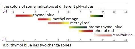 In acid environment (or in reducing environment) the above equilibria are at the left, so the color of HIn dominates (or the color of RedIn). Per indicator this can vary substantially. |