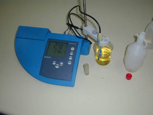 O medidor do pH (azul) indica um valor de 2,70 o que mostra o carácter da solução: vinagre (o líquido amarelo no copo de vidro).