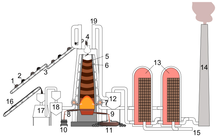 2C(s) +O2(g)Zuurstof uit de lucht verbrandt de koolstof uit de cokes en het poederkool; daarbij ontstaat koolstofmonoxide (CO). Het CO gas, dat een temperatuur van ongeveer 2200-2400°C heeft, stijgt op door de lagen cokes en erts heen.2CO(g)